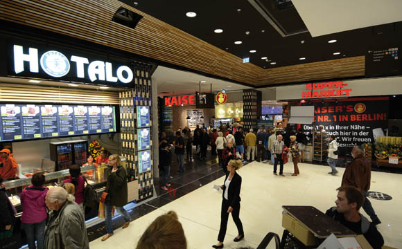 Der Anteil an Convenience-Ware, vegetarischen und veganen Artikeln ist hoch. Zielgruppe sind vor allem junge Leute und Laufkundschaft. Wer mit dem Auto kommt, muss ins Parkhaus. Ab einem Einkaufswert von 25 Euro übernimmt Kaiser’s das Parkticket für die erste Stunde. Als Serviceleistung für Kunden ist auch die Kooperation mit der Pin Mail AG zu verstehen. Vor der Kasse im Markt steht eine typische, knallgrüne Postbox zum Einwerfen von Briefen, und wem noch eine Briefmarke fehlt, der kann sie bei Kaiser’s problemlos kaufen. Kompetenz in Sachen Fisch und Meeresfrüchte sollen nicht nur die Bedientheke und eine Kühlinsel für abgepacktes Sushi zeigen, sondern auch der Frontcooking-Bereich, der derzeit am Markteingang entsteht. Champagner und edle Weine sowie hochwertige Fischgerichte können hierkünftig genossen werden. Ein wenig Luxus und Flippigkeit für den Alltag eben.