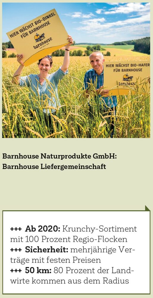 Mehr Bio-Anbau: Barnhouse Naturprodukte will Anreize geben, Biobetriebe zu erhalten oder auf Bio umzustellen. Heute bauen knapp 90 Bio-Landwirte der Verbände Demeter, Naturland, Bioland und Biokreis aus einem Umkreis von maximal 100 Kilometern für Barnhouse Hafer und Dinkel an – Hauptzutaten in jedem Bio-Knuspermüsli der Marke. Geflockt wird das Korn beim Partner PrimaVera-Mühle vor Ort. Gemeinsam wird der Öko-Anbau in der Region weiterentwickelt: Auf den Barnhouse-Feldern werden Artenvielfalt und Bodenqualität gefördert.