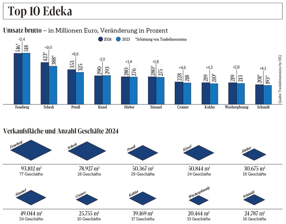 Kräftig zugelegt haben Scheck (Edeka Südwest) und WEZ Preuß (Edeka Minden-Hannover) im vergangenen Jahr. Bei Edeka Scheck aus Achern wirkten sich zwei Neueröffnungen im Herbst 2023 vollumfänglich und eine im Herbst 2024 anteilig positiv aus. Nach Schätzungen von Tradedimensions stieg der Umsatz von Scheck von 388 auf 423 Millionen Euro; ein Plus von 9 Prozent.